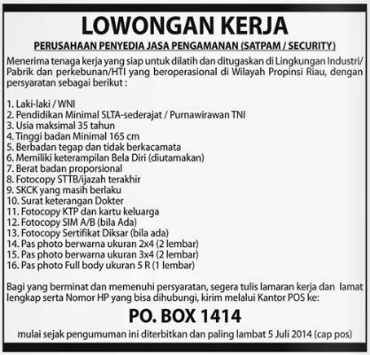 Lowongan Kerja Satpam Security Di Pekanbaru Riau Tahun Ini Satpam Pekanbaru Riau Informasi Satpam Jasa Lowongan Pendidikan Seragam Diksar Satpam Dll from 4.bp.blogspot.com Jul 01, 2021 · bursa lowongan kerja depnaker terbaru lulusan sma smk d3 s1 semua jurusan lowongan bank bumn cpns juli 2021 Tugas utama seorang marketing adalah menghasilkan sales atau penjualan dari produk yang dimiliki oleh perusahaan, sehingga perusahaan mendapatkan keuntungan dari setiap produk yang dijual. Lowongan kerja satpam pondok pesantren assunniyyah jember Jun 05, 2021 · untuk menambal 20 jabatan yang ditinggalkan, pemerintah provinsi (pemprov) banten pada, kamis (3/6/2021), telah membuka lowongan bagi aparatur sipil negara (asn) baik di lingkungan pemprov banten, kabupaten/kota maupun kementerian dan lembaga. Berikut ini adalah lowongan kerja terbaru juli 2021 di jobindo.com untuk lulusan sma smk d3 s1 s2 untuk semua jurusan di perusahaan bumn cpns di seluruh indonesia. Lowongan kerja terbaru di tangerang ini membutuhkan posisi sebagai marketing dan sales. Jul 01, 2021 · dibawah ini merupakan beberapa informasi yang telah kami himpun mengenai lowongan kerja bumn terbaru pada bulan juli tahun 2021 dari sumber informasi lowongan kerja terpercaya, semoga informasi ini dapat bermanfaat bagi pembaca yang sedang mencari pekerjaan. Infokerja.net situs lowongan kerja terbaik dan terpercaya menyampaikan informasi lowongan kerja terbaru 2021 untuk lulusan sma stm d3 s1 s2 semua jurusan di bumn